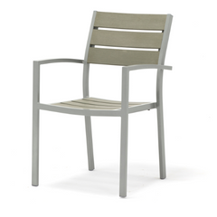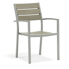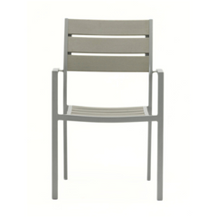 Fauteuil moderne, empilable, structure en aluminium, assise et dossier en bandes de plastique solides aspect bois, adapté à une utilisation en extérieur