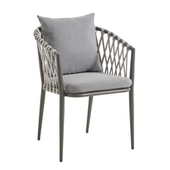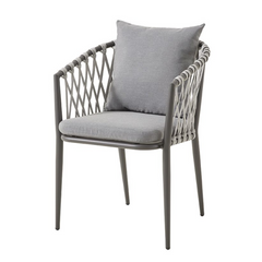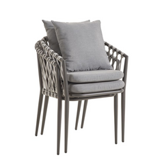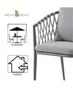 Chaise de patio moderne et empilable Krimo-04 gris clair. La chaise allie un design moderne à une plus grande fonctionnalité. Le cadre en aluminium durable et la maille textilène résistante aux intempéries garantissent une excellente durabilité.