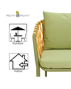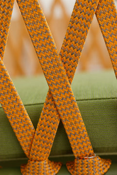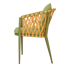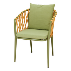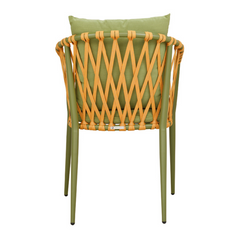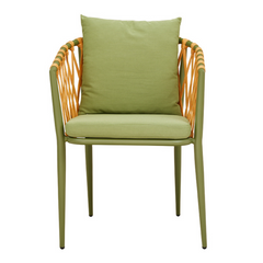 Krimo-01 Vert Orange Chaise de patio moderne et empilable. La chaise allie un design moderne à une plus grande fonctionnalité. Le cadre en aluminium durable et le tissage en textilène résistant aux intempéries garantissent une excellente durabilité.