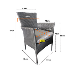 Largeur : 55 cm, profondeur 59 cm, hauteur : 84 cm, hauteur d'assise : environ 48 cm, coussin compris, profondeur d'assise : environ 46 cm, hauteur du dossier : environ 84 cm, largeur du dossier supérieur : environ 47 cm. Poids : 5 kg. De conception moderne, cette chaise de jardin est particulièrement adaptée à une utilisation en extérieur, que ce soit sur la terrasse, dans le jardin, le salon ou le coin repas.