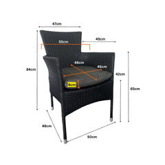 Largeur : 55 cm, profondeur 59 cm, hauteur : 84 cm, hauteur d'assise : environ 48 cm, coussin compris, profondeur d'assise : environ 46 cm, hauteur du dossier : environ 84 cm, largeur du dossier supérieur : environ 47 cm. Poids : 5 kg. De conception moderne, cette chaise de jardin est particulièrement adaptée à une utilisation en extérieur, que ce soit sur la terrasse, dans le jardin, le salon ou le coin repas.