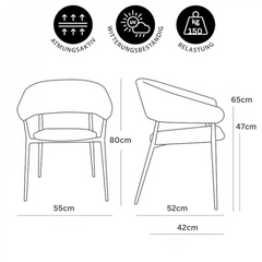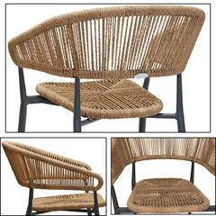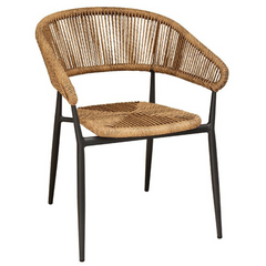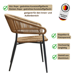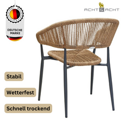Une chaise de patio avec accoudoirs pour un plus grand confort d'assise. L'assise et le dossier sont recouverts d'une corde d'extérieur durable, résistante aux intempéries et facile d'entretien. La corde sèche rapidement. La chaise est empilable.