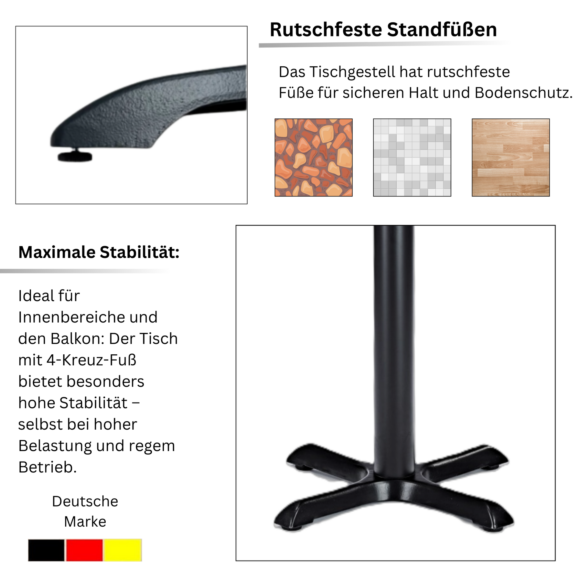 Das pulverbeschichtete Gusseisen-Gestell (42,5 x 42,5 x 72 cm) sorgt für Stabilität und ist mit Bodenausgleichsschrauben ausgestattet.