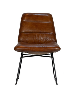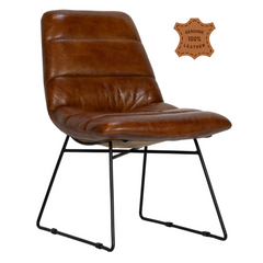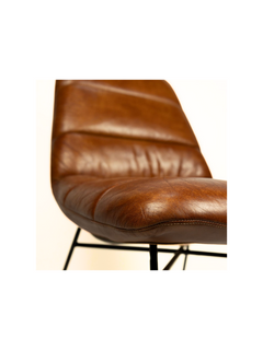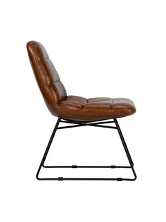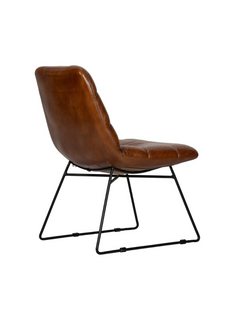 Das Gestell des Sessels besteht aus robustem, schwarzem Metall, das pulverbeschichtet ist und somit eine matte und langlebige Oberfläche bietet. Die Polsterung des Sessels ist mit hochwertigem Leder in einem warmen Cognac-Ton bezogen, was dem Möbelstück eine einladende und luxuriöse Note verleiht.