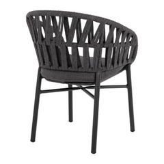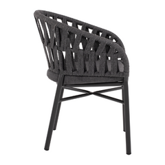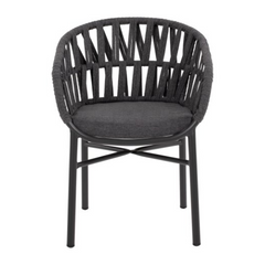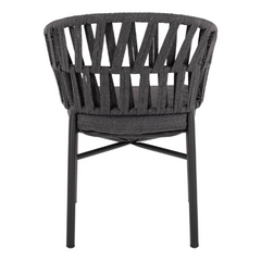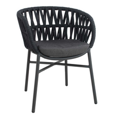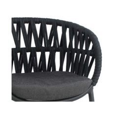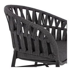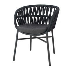 Moderner, stapelbarer Sessel mit einem stabilen Aluminiumrahmen in Anthrazit. Die Sitz- und Rückenfläche besteht aus robustem Textylene, ergänzt durch elastische Gummiseile, die sowohl Komfort als auch eine ansprechende Optik bieten. Der Sessel wird mit einem farblich abgestimmten Kissen in Anthrazit geliefert, das zusätzlichen Sitzkomfort garantiert. Ideal für den Außenbereich dank witterungsbeständiger Materialien.
