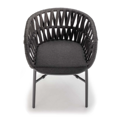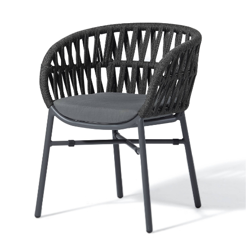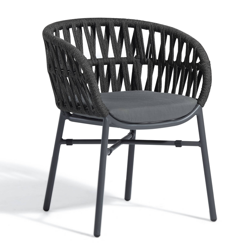 Moderner, stapelbarer Sessel mit einem stabilen Aluminiumrahmen. Die Sitz- und Rückenfläche besteht aus robustem Textylene, ergänzt durch elastische Gummiseile, die sowohl Komfort als auch eine ansprechende Optik bieten. Der Sessel wird mit einem farblich abgestimmten Kissen in Anthrazit geliefert, das zusätzlichen Sitzkomfort garantiert. Ideal für den Außenbereich dank witterungsbeständiger Materialien.