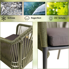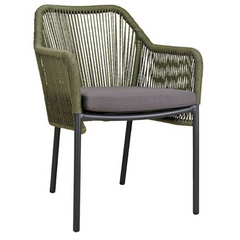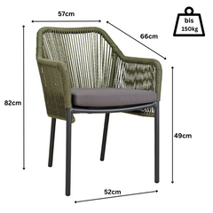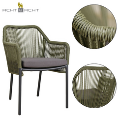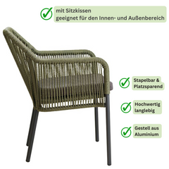 Dieser Terrassenstuhl mit Armlehnen bietet dank eines Sitzkissens hohen Komfort. Die Rückenlehne besteht aus strapazierfähigem, witterungsbeständigem Outdoorseil, das schnell trocknet. Der Stuhl hat ein dunkelgraues Aluminiumgestell, Sitz- und Rückenflächen aus gedrehtem Kunststoffgeflecht, ist UV-beständig, stapelbar und in Naturfarbe erhältlich. Sitzkissen inklusive, Rückenkissen optional.