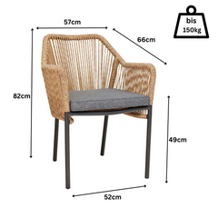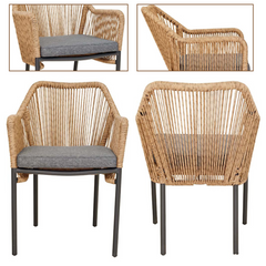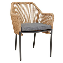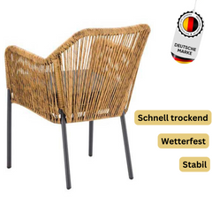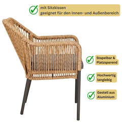 Dieser Terrassenstuhl mit Armlehnen bietet dank eines Sitzkissens hohen Komfort. Die Rückenlehne besteht aus strapazierfähigem, witterungsbeständigem Outdoorseil, das schnell trocknet. Der Stuhl hat ein dunkelgraues Aluminiumgestell, Sitz- und Rückenflächen aus gedrehtem Kunststoffgeflecht, ist UV-beständig, stapelbar und in Naturfarbe erhältlich. Sitzkissen inklusive, Rückenkissen optional.